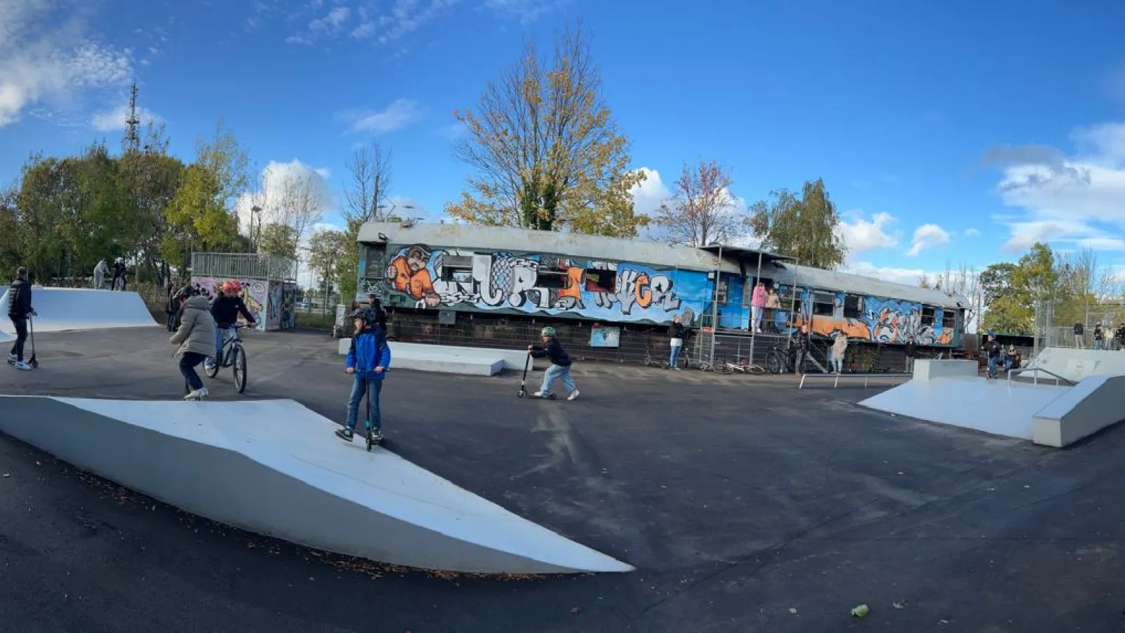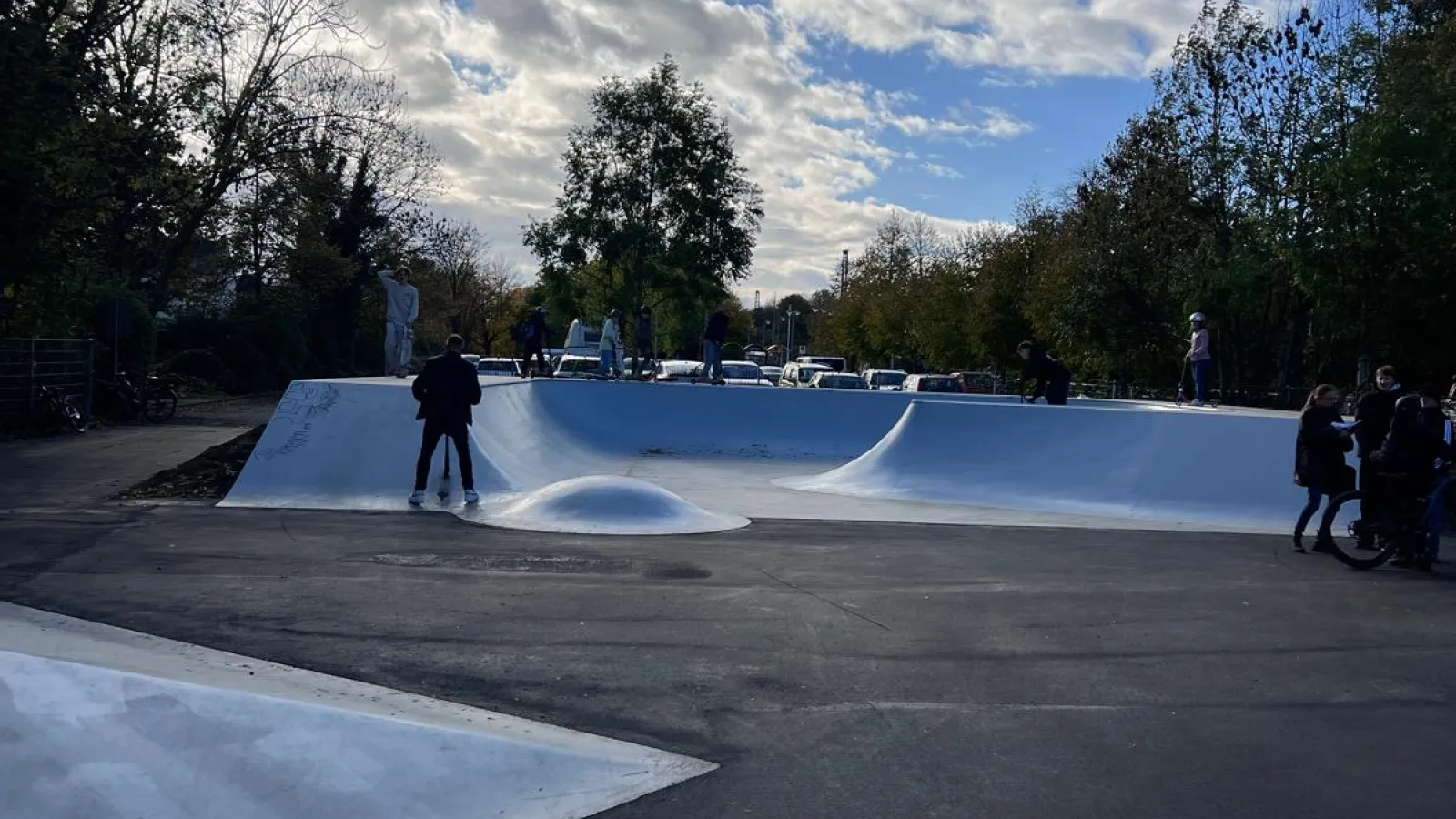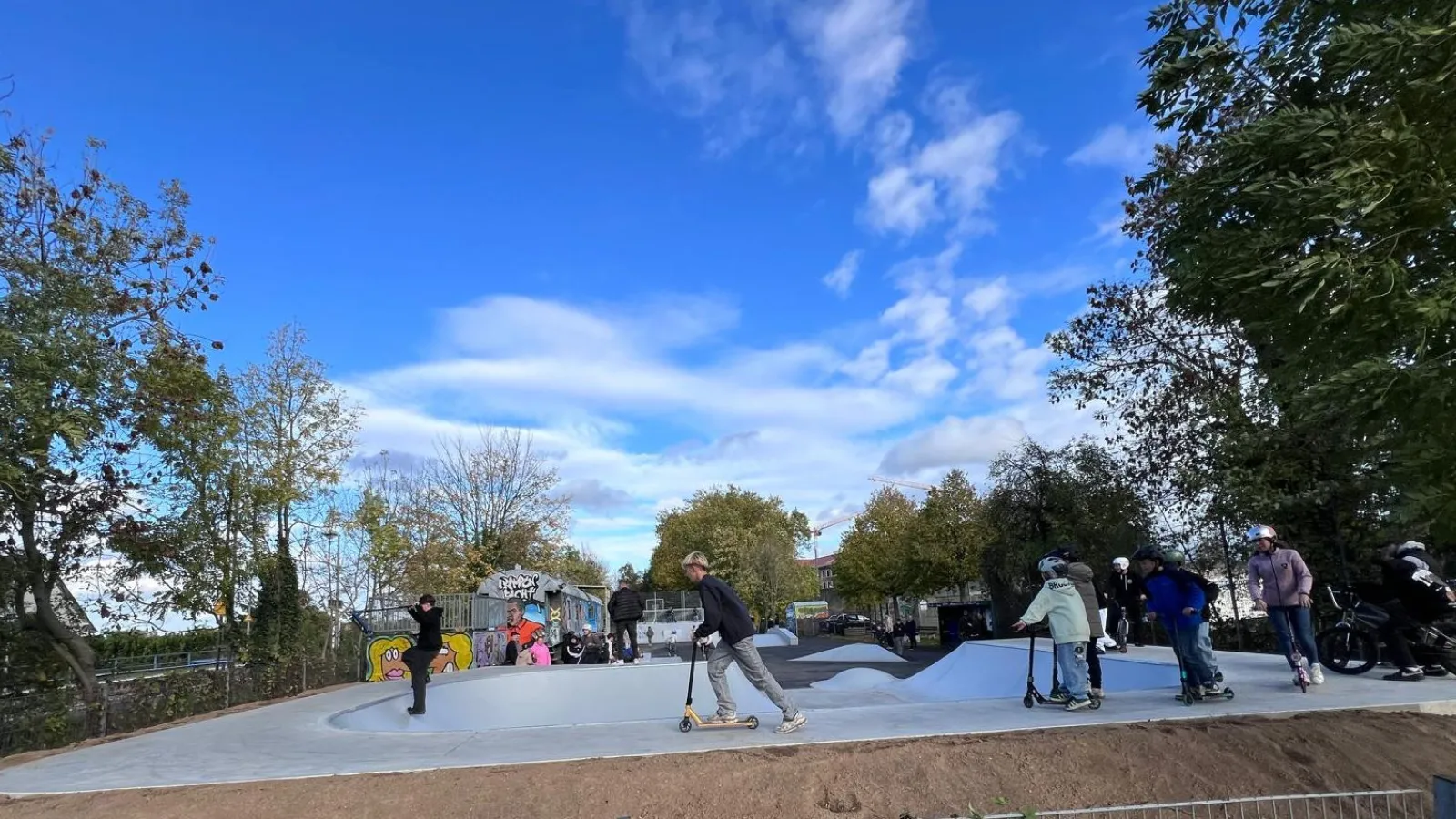 Auf einer Gesamtfläche von rund 1000 Quadratmetern sind jetzt rund 100 Quadratmeter „Betonflat“ am Start, außerdem fast 160 Quadratmeter Skate-Elemente und rund 120 Quadratmeter Grünfläche, umgesetzt von „Populär Skateparks“ aus Nürnberg. Das „Populär“-Team entwirft und baut seit 1994 Skateparks für Skateboarder und Biker hat bereits mehr als 200 Objekte im In- und Ausland realisiert.